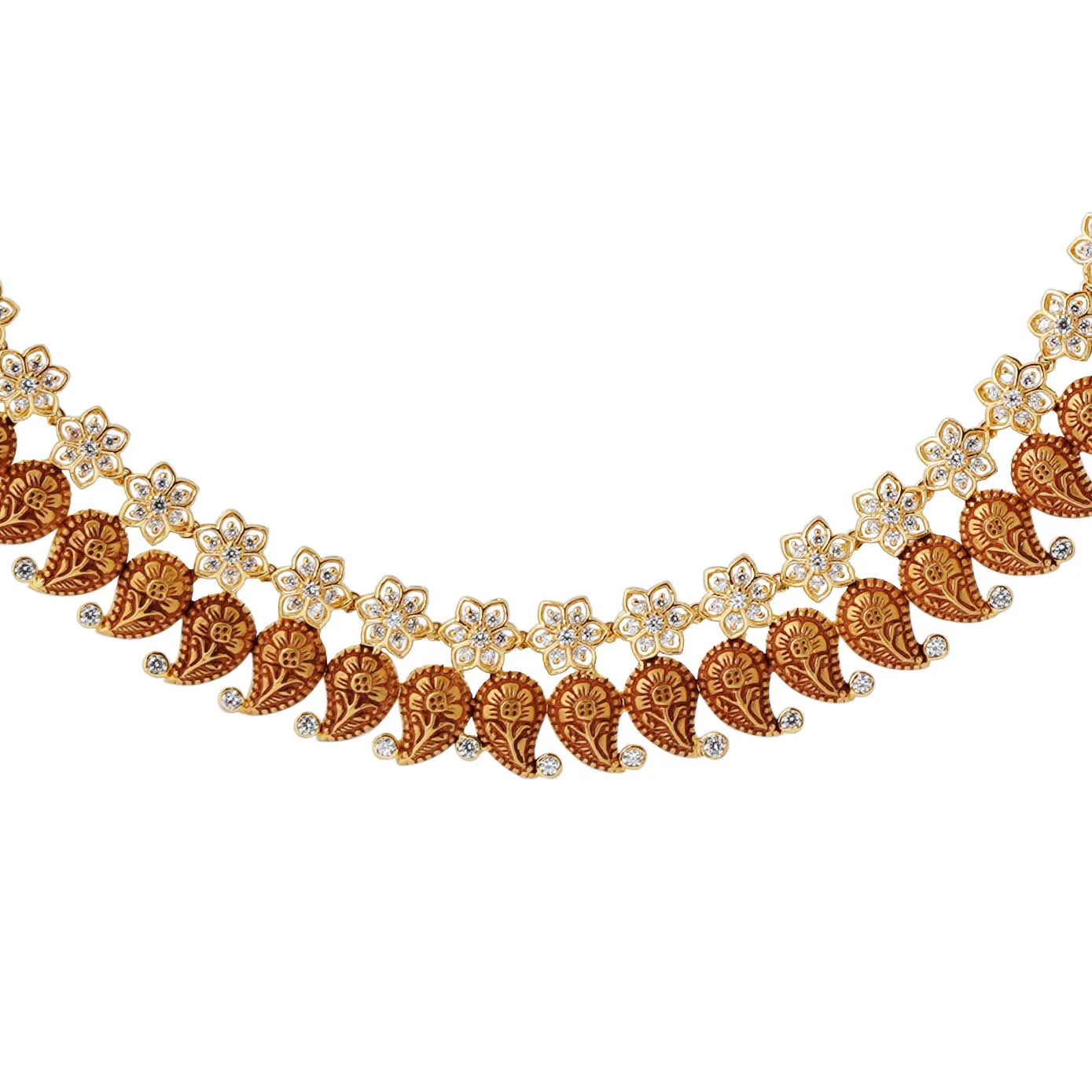 An astounding piece of necklace that has six petaled florets on the top layer with CZ stones and connected with paisley motifs embossed with floral designs on it. This whole beauty is finished with red matt finish to make this peculiar beauty more unique.