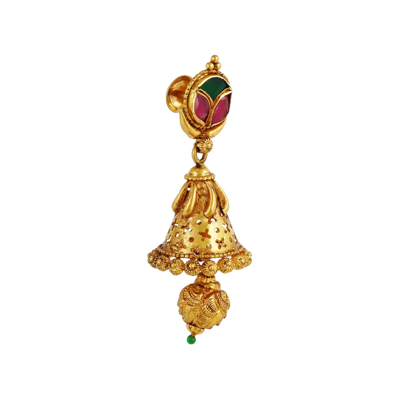 A colorful enamel added to the jumkka top in a simple design fastened to a bell shaped jumkka. The jumkka is designed with special cuts and floral petals, the jumkka ended with circular rims on it. finally the golden bead is added finally to it.