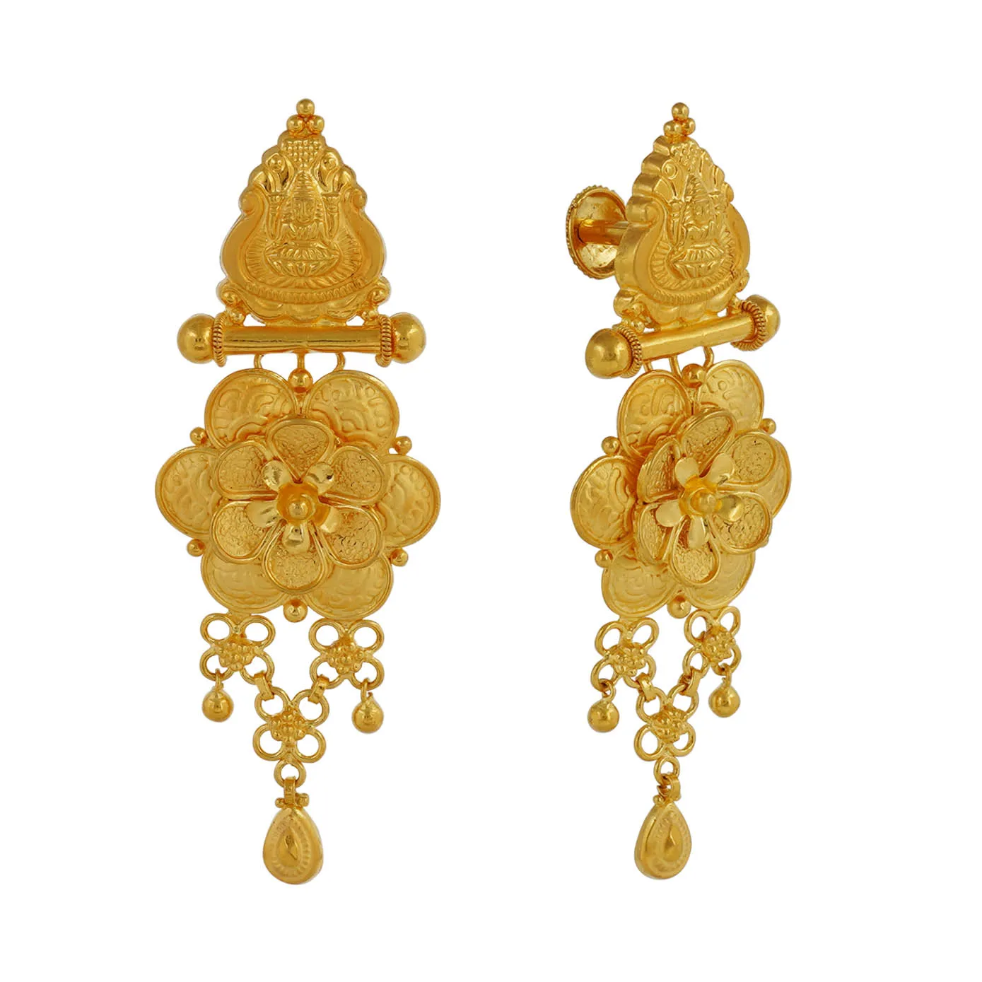 A beautiful hanging earring with Lakshmi motif top and six petaled flower in the drop with golden beads to finish the look.