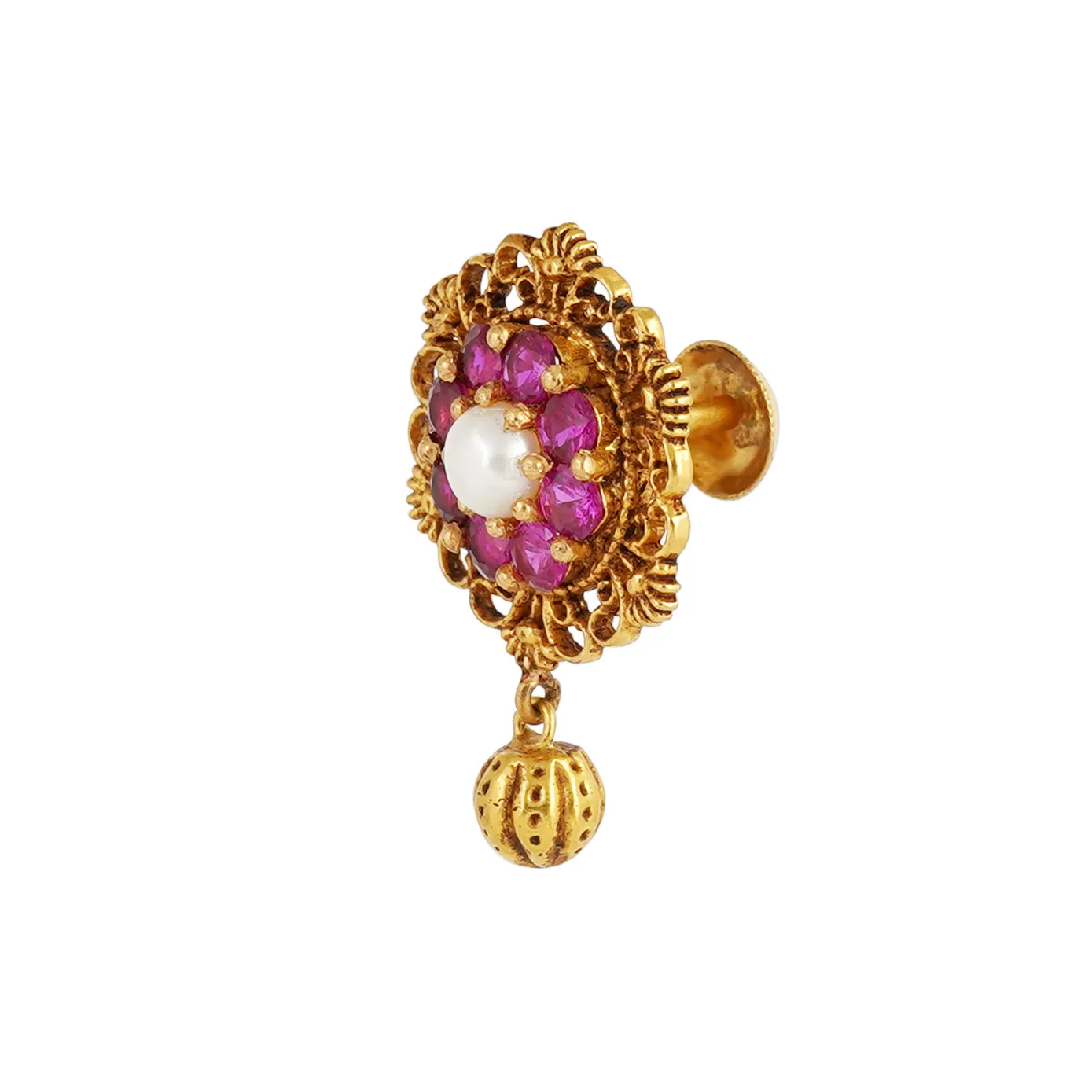 A hexagonal shaped stud with floral filigree centered with pink stones and pearl. The final drop is done with pumpkin bead to finish the earring will really be a companion to your ethnic outfits.